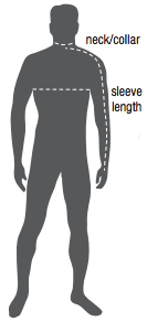 SLEEVE LENGTH: With arm relaxed at side and slightly bent, measure from center back neck, over the shoulder, down to the outer wrist.